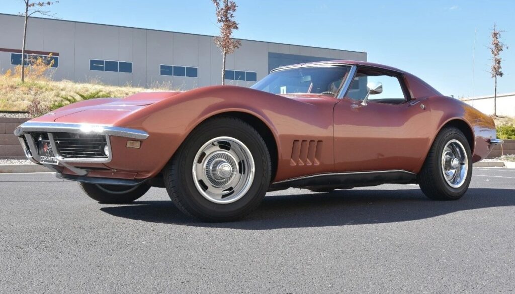 Sunny afternoon view of this classic Riverside Gold 1969 Chevrolet Corvette Coupe